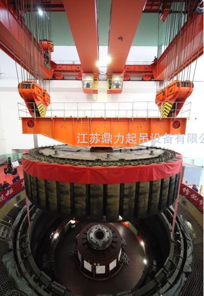 能吊起600噸重量的神器你見過嗎?去年11月陜西某水電站4號(hào)發(fā)電機(jī)轉(zhuǎn)子起吊。這個(gè)轉(zhuǎn)子自重600噸,加上吊具共653噸,是該廠機(jī)組最重的大型部件。在兩臺(tái)天車同時(shí)發(fā)力下,經(jīng)過3次起吊試驗(yàn)后,轉(zhuǎn)子從基坑內(nèi)緩緩吊出并穩(wěn)穩(wěn)的落在安裝間的轉(zhuǎn)子支墩上,等待工作人員開展下一步檢修工作。